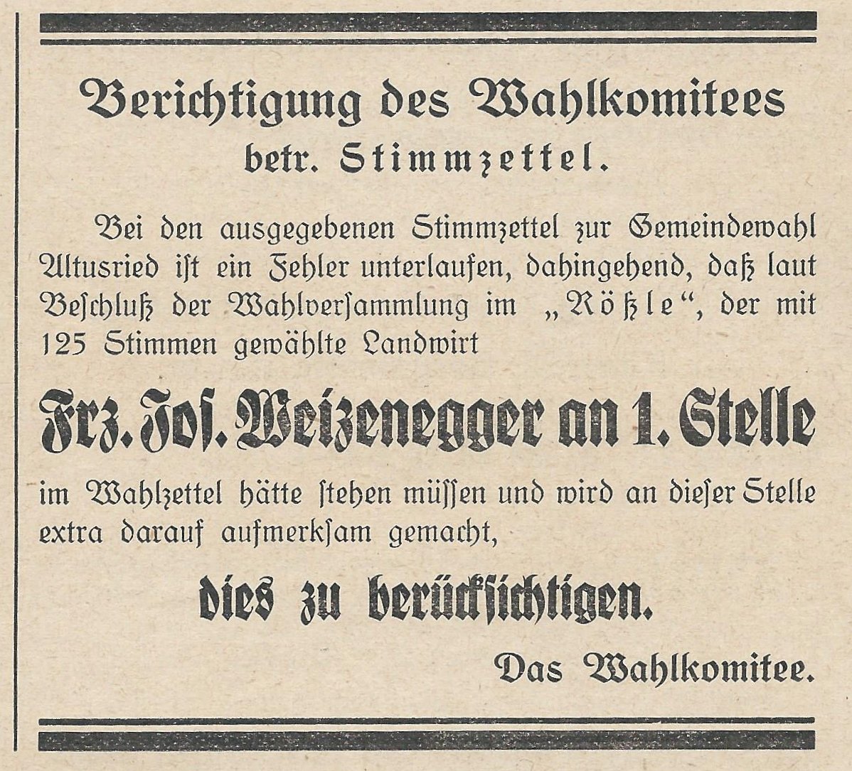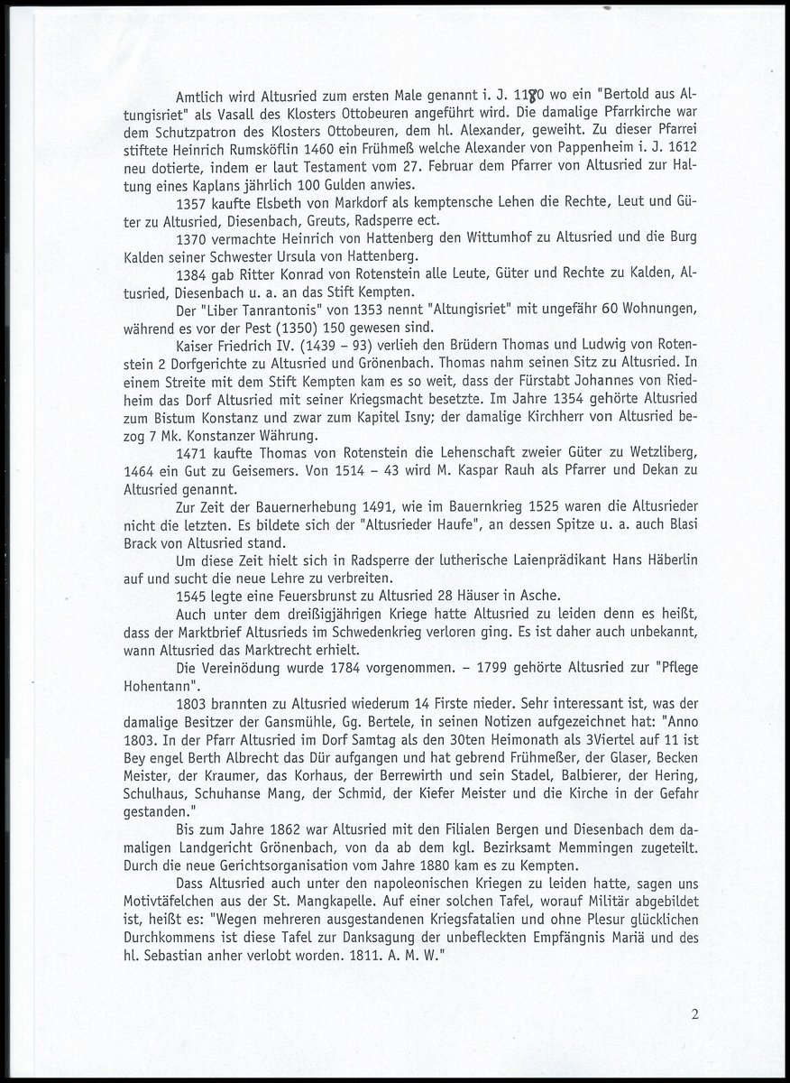 - Im Wochenblatt veröffentlichte Joseph Maria Einsiedler seine Erinnerungen an den Altusrieder Pfarrer Matthias Bach 1869- 1893. Sie geben einen interessanten Einblick in das Zeitgeschehen.