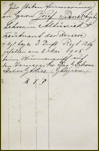 Bild 2: Zur Erinnerung an Herrn Josef Pixner Augsburg, Leutnant der Reserve im kgl. bayer. Regiment. Gefallen am 2. Mai 1915 bei einen Sturmangriff in Gallizien. RIP