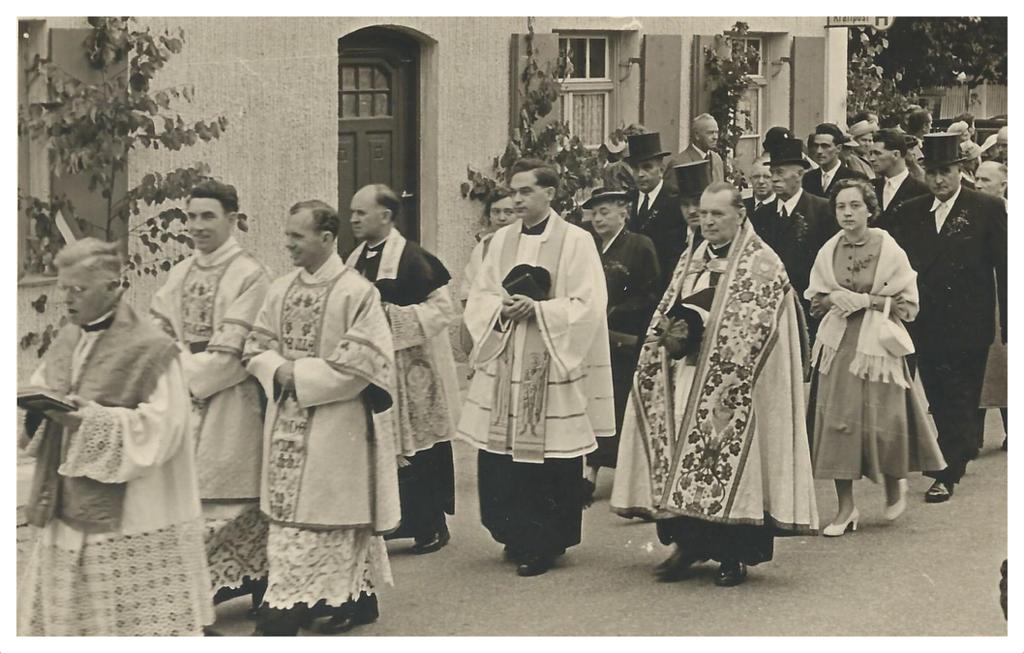 Pfarrer Sälzle zweiter von links, auf der unteren Treppenstufe zwei Kapuzinerpater, die als Volksmissionare die Volksmission durchführten. Unter Volksmission verstand man Aktivitäten zur Glaubenserneuerung.