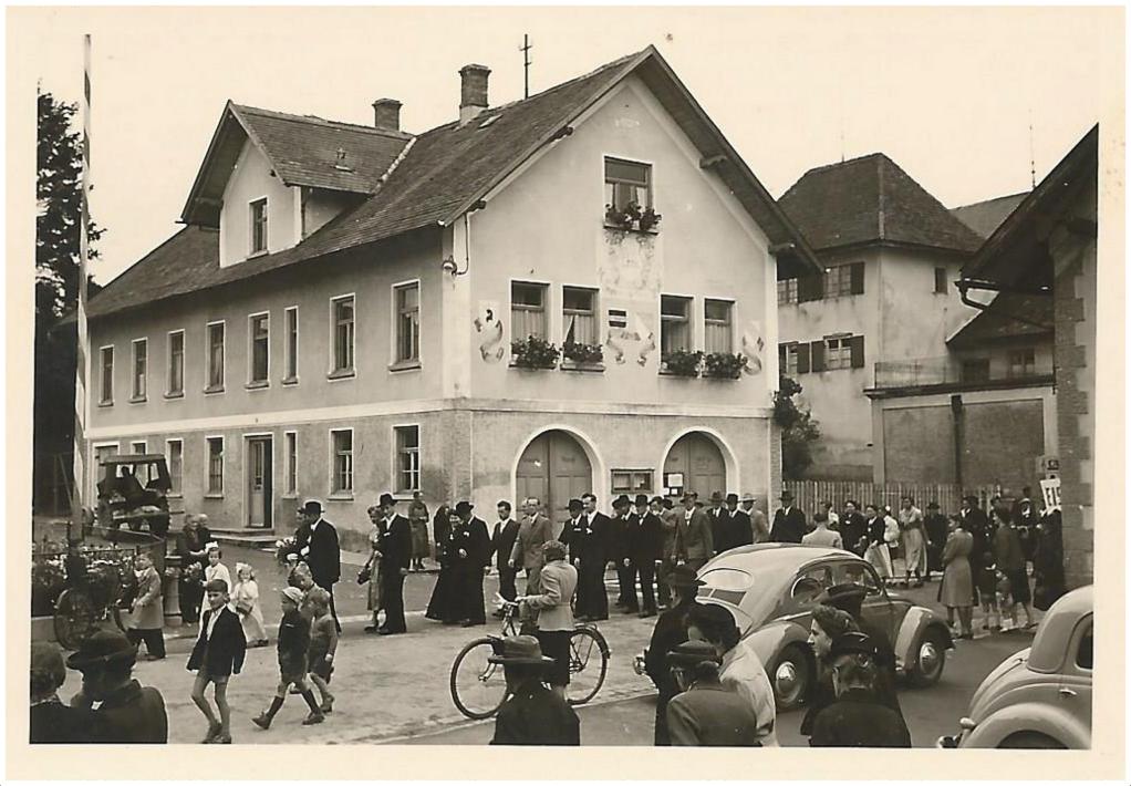 Auf unserem Foto ist die Schule aus. Die Kinder verlassen die Schule. Doch ein Fotograf, sicherlich mit großer Ausrüstung wie damals üblich, hat sich in den Weg gestellt. In der ersten Reihe sind fünf Kinder, sie sind überrascht, erstaunt und vielleicht auch misstrauisch. Sie wissen nicht , sollen sie weiterlaufen oder in Position stehen bleiben; die Mädchen mit Zöpfen und Schürzen, die Buben barfuß, Männer mit Strohhut. Die Straße ist noch ungeteert und ungepflastert. Unter der Türe beim Eingang des Gasthauses zur Sonne steht ein Mädchen, es ist Justine Natterer, später die Sonnenwirtin Justine Hartmann, geboren 1898, gestorben 2000. Sie wurde 102 Jahre alt und hat drei Jahrhunderte erlebt.