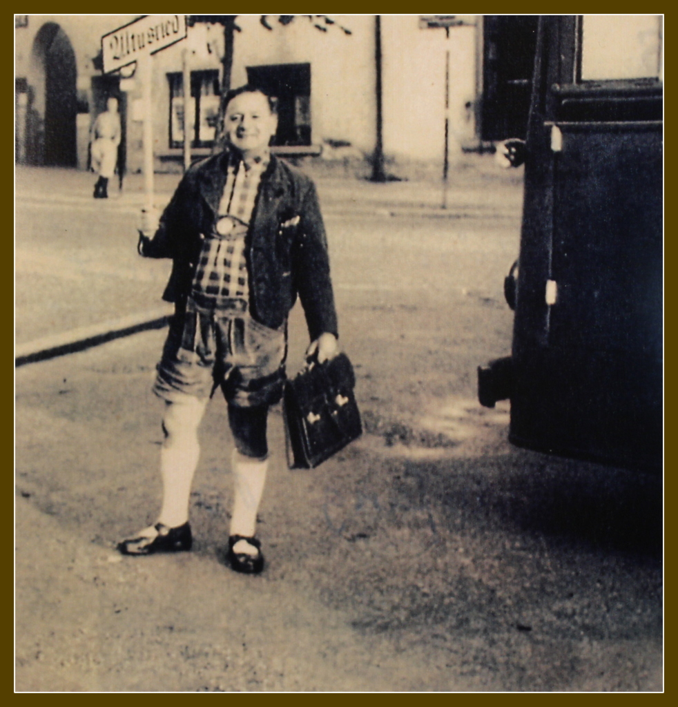 4. Joseph Zimmermann empfängt in bayerischer Tacht die Gäste vor dem Bahnhof Kempten.