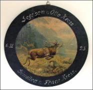 Zwölf Jahre nach der von Hand gemalten Scheibe von Ferdinand Geißelmann hat sich der Farbdruck durchgesetzt. Das beliebteste Motiv ist der Rothirsch. Leicht lässt sich das Papier aufkleben. Die Strahlen mit dem Bleistift gezogen erleichtern das Auszählen der Punkte. Gestiftet wurde die Scheibe von Otto Kress und gewonnen von Franz Kress.