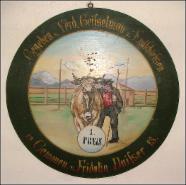 Ferdinand Geißelmann malte und spendete zum Endschießen anno 1913 diese Schützenscheibe. Der Gewinner des 1. Preises war Fridolin Daiser. Gekonnt hat Geißelmann die preisgekrönte Kuh von vorne gemalt. Der Bauer mit dem Stecken trägt einen roten Wams und einen Hut mit Feder. Die Preistierschau 1913 erfolgte offensichtlich auf dem Gelände der heutigen Allgäuer Tierzuchthalle. Das lässt sich aus dem Panoramabild der Allgäuer Alpen rückschließen. Grünten und Großer Daumen sind deutlich erkennbar.